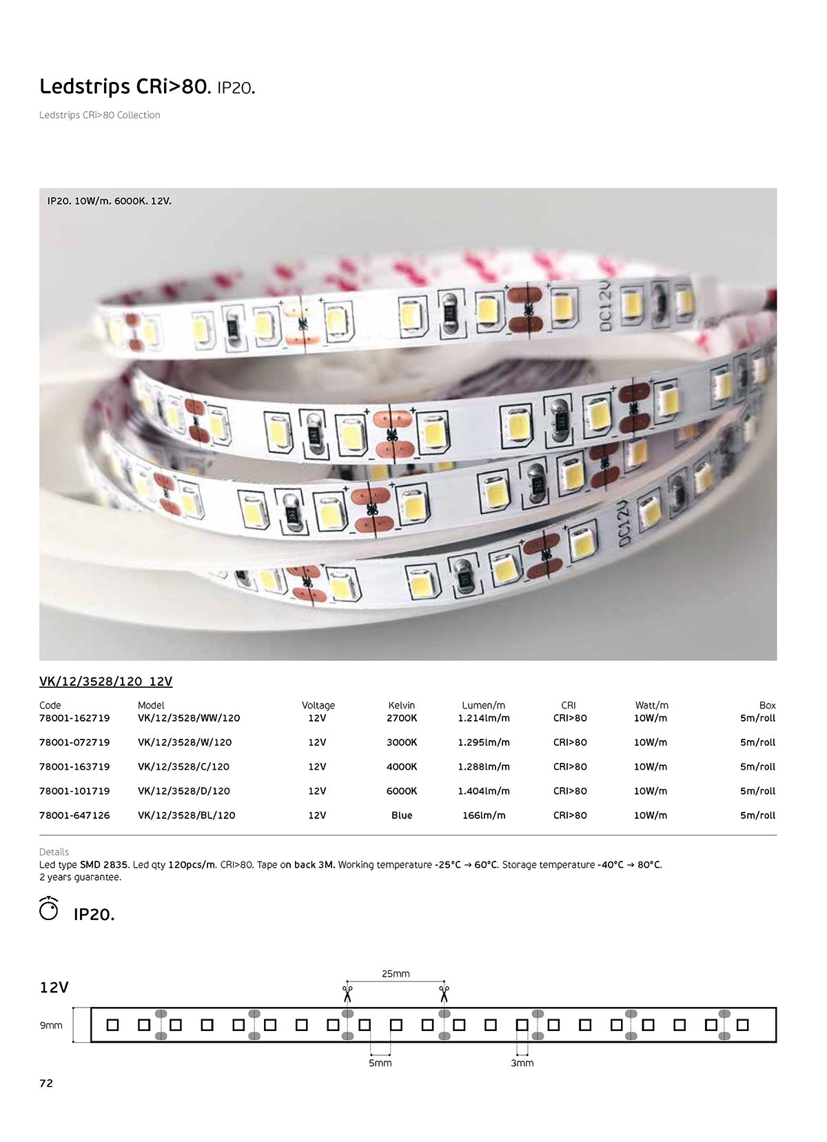Ταινία Led SMD 2835, 12V, 10W/m, 1.288lm/m, 4000K, 5m/roll, CRI>80, IP20