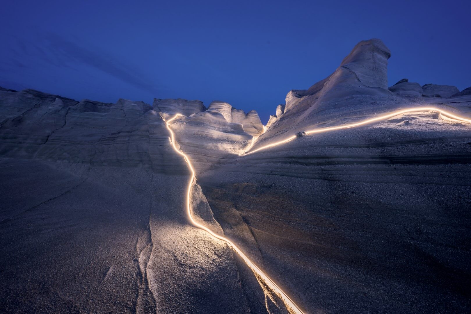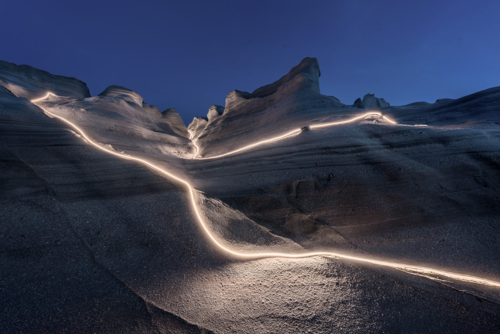 Milos was always one of our favourite islands, so it didn’t take much time for us to decide that trip to Sarakiniko. Besides it was the ideal landscape to try out KEISO flexible phototube and present how the product can blend perfectly with the nature. The strange, sinuous shapes of this landscape, that has been shaped by the winds through the years, was the perfect challenge for us.