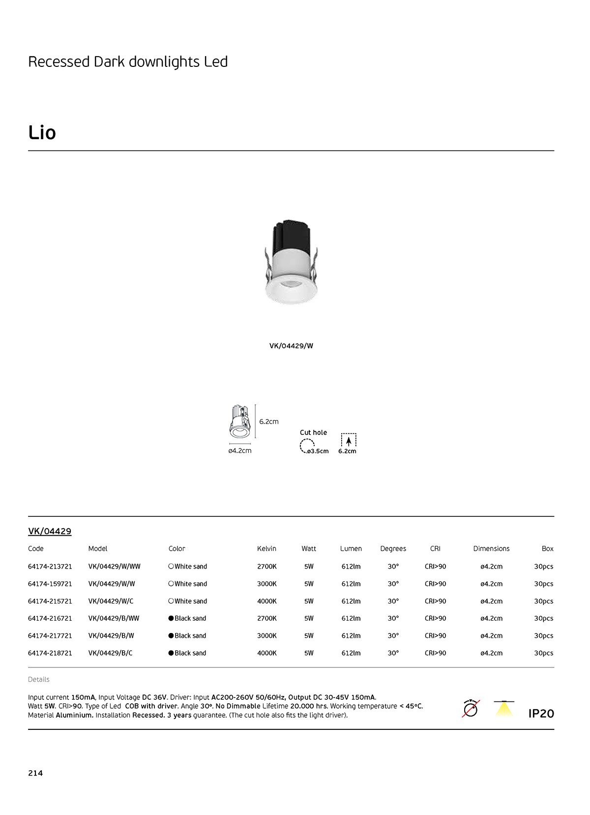 Lio Fb Pin Email Viber Lio VK/04429/W/W Recessed ceiling light led, 5W, 3000K, 612lm, 30°, CRI>90, IP20, ø4.2cm, white Kelvin 3000KPower 5WLumen 612lmVoltage 200-260V Please login to add to Order List, and / or to view all product information, availability, and pricing. VK Leading Light Since 1978 A: 8 Aristotelous str., Tavros, 177 78 Athens, Greece T: +30 210 99 69 610 - 11, +30 210 34 58 072 + 075 F: 210 99 58 374 E: info@vkleadinglight.gr, W: https://vkleadinglight.gr