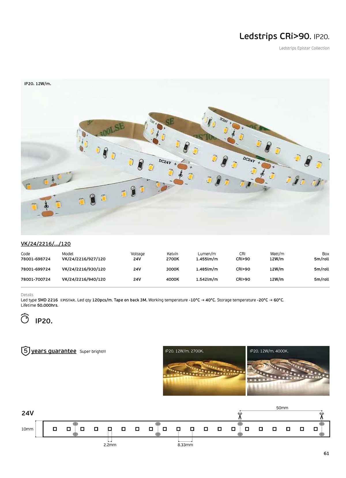 Ταινία Led SMD 2216 EPISTAR, 24V, 12W/m, 1.485lm/m, 3000K, 5m/roll, CRI>90, IP20