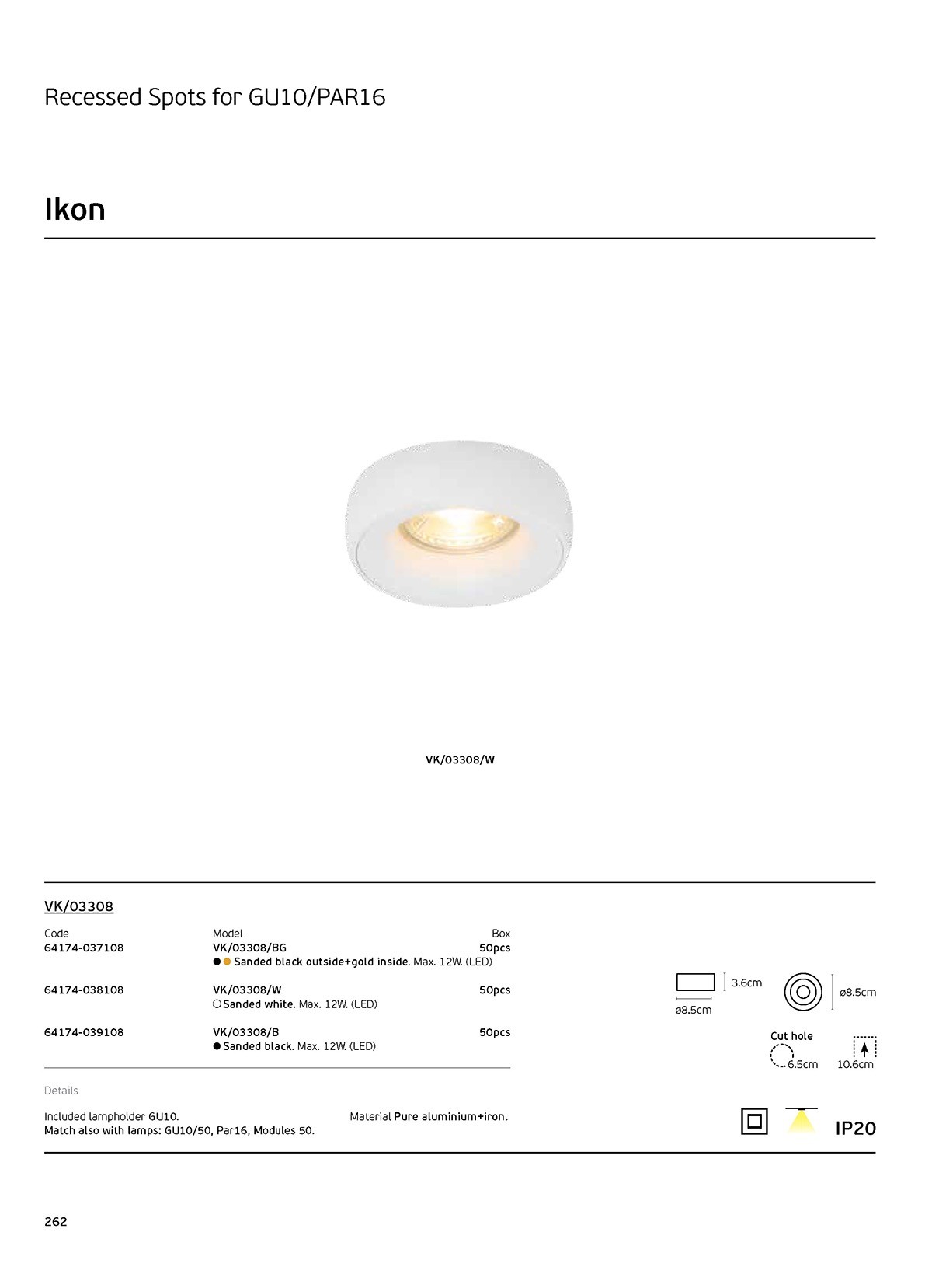 Χωνευτό σποτ, σταθερό για GU10/PAR16, Max12W (LED), IP20, ø8.5x3.6cm, sanded black outside+gold inside