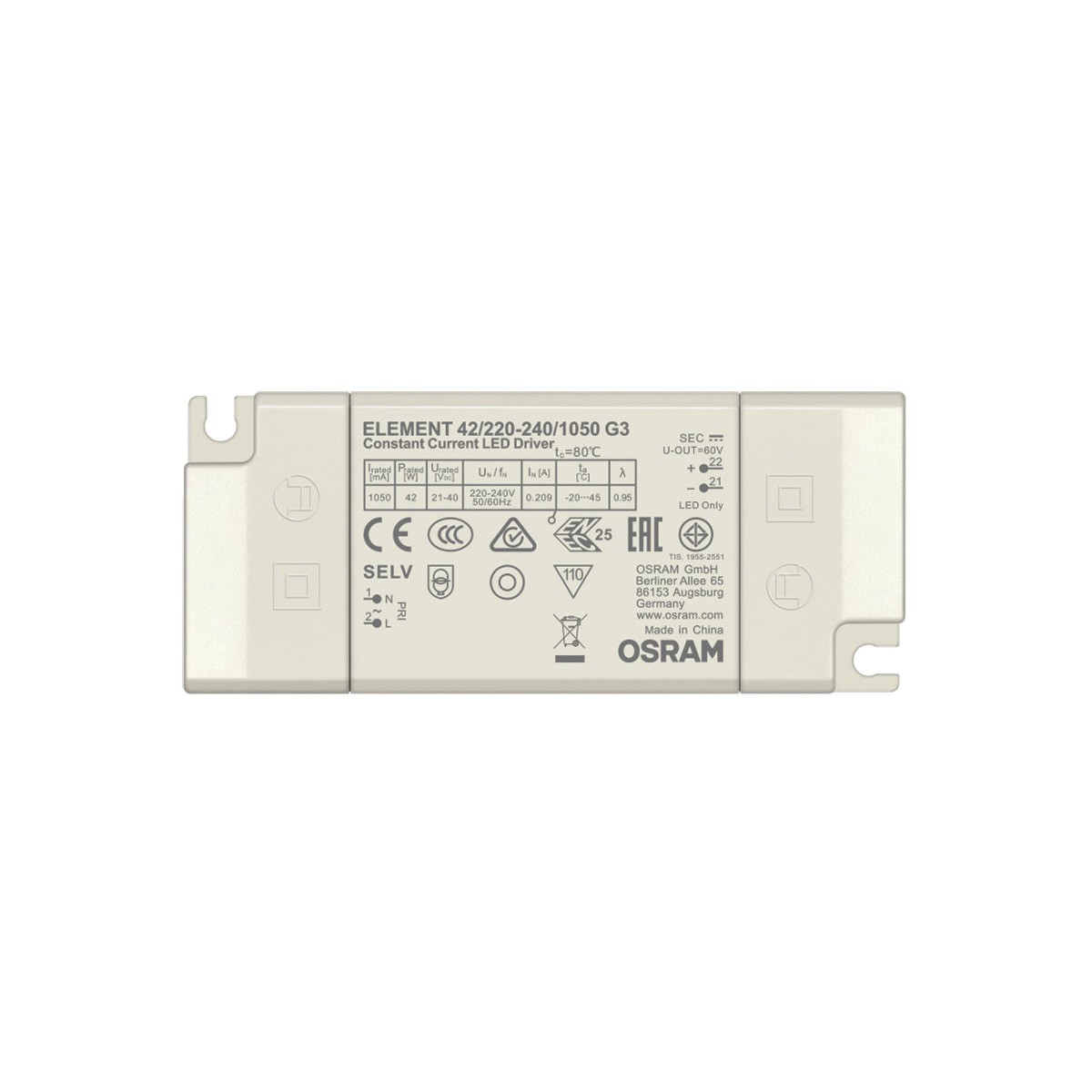 LED τροφοδοτικό OSRAM για modules D111, 22-42W, AC198-264V, DC1.050mA